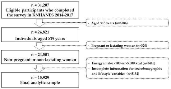 The study included Korean adults aged ≥19 years who participated in the KNHANES 2014–2017. A total of 31,207 participants completed the survey in KNHANES 2014–2017. After excluding participants aged <19 years (n = 6386), pregnant or lactating women (n = 320), those with energy intake of <500 or >5000 kcal/day (n = 3440), and those with incomplete sociodemographic and lifestyle data (n = 5132), a total of 15,929 (7201 men and 8728 women) were included in the final analysis (Figure 1). The institutional review board (IRB) of the by the Korea Centers for Disease Control and Prevention (KCDC) reviews and approves the KNHANES survey (approval no. 2013-12EXP-03-5C). Informed consent was obtained from all participants when the surveys were conducted. IRB approval was not required because the KNHANES is a publicly available dataset.