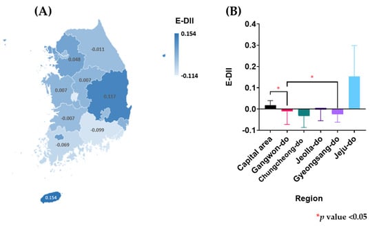 In the present study, we evaluated the regional differences of the E-DII across the six regions in South Korea. Korean adults in the Capital area had a significantly higher E-DII than those who live in Gangwon-do and Gyeongsang-do. This finding indicates that people who live in the Capital area are more likely to demonstrate a pro-inflammatory diet than those who live outside of the Capital area. Wirth et al. reported that a higher DII was associated with lower diet quality [], and diet quality is influenced by socioeconomic status [,]. This implies that the DII is influenced by socioeconomic status such as income inequalities that exist by region and may be due, in part, to regional differences in rurality. Kim and Jeong [] reported that income inequality in South Korea was due to the differences as demonstrated by the relatively very high income in the Seoul Metropolitan Area, which is the most developed region of the nation.