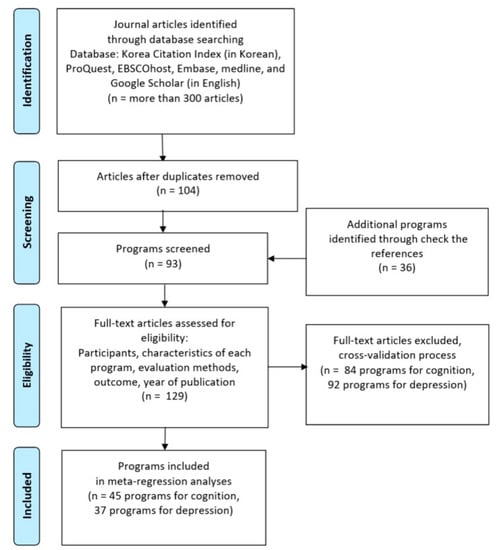 This study reviewed programs conducted in South Korea for improving cognitive function and alleviating depression symptoms in older adults with dementia. Moreover, this study conducted a meta-analysis for comprehensively comparing the effect sizes of these programs. This study included searching, collecting, selecting, coding, and standardizing the effect sizes as well as conducting statistical analyses based on the standard procedure suggested in Preferred Reporting Items for Systematic Review and Meta-Analysis []. This study protocol was approved by the institutional review board of Korea Institute for Health and Social Affairs (IRB No. 2018-02).