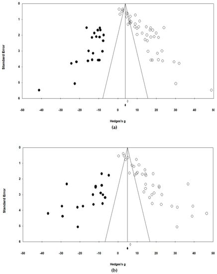 The meta-analysis was conducted using comprehensive meta-analysis (CMA) Version 3. This study analyzed Hedge’s g, which reflects the difference in effect sizes and the weight of a sample size, without using moderating variables with a random effect model (Figure 2). Two computational models are generally used to calculate the mean effect size in a meta-analysis (i.e., fixed effect model and random effect model). The two models had different estimated mean effect sizes and precisions. This study used the random effect model because the target studies used different samples and intervention methods and each study assumed different population effects in an independent environment []. The heterogeneity of the effect size distribution of the final selected studies can be found in the funnel plots of Figure 3. The Egger’s regression test was also used for statistical analysis of the heterogeneity. The effect sizes were heterogeneous among studies (Figure 2 and Figure 3). Therefore, it was appropriate to acknowledge the heterogeneous variance between studies and apply a random effect model that had more balanced weights. In addition, the traditional fail-safe N method was used to identify publication bias, and it could be proven that the publication error was not significant.