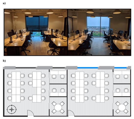 The participants relocated to office suites in the Durham ID building for two workweeks in November of 2019. The participants were randomly assigned to one of the two test offices for the first week and then switched to the other office for the following week. The demographics of the two groups were similar in terms of sex, age, education, race, job function, and baseline health (Table 1). They conducted their normal office work from 9:00 am to 5:00 pm with lunch provided within the premises at noon on each day. Each office suite had three breakout rooms (Figure 1b) for participants to conduct phone calls without having to leave the space, as well as printing and bathroom access located on the same floor.