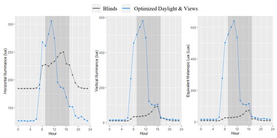Daily variation in horizontal illuminance, west-facing vertical illuminance, and west-facing vertical equivalent melanopic lux in the two office environments.