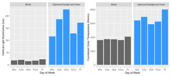 Light measurements taken at participants’ desks reveal large differences in horizontal and vertical illuminance exposures across the two test conditions (Figure 2 and Figure 3). Moreover, the correlated color temperature (CCT) of the daylight penetrating into the office with EC glass was much higher than in the office with blinds, with levels between 7500 K and 8700 K throughout the morning hours that then dropped below 5000 K after 4:00 PM (Figure 2 and Figure 3). In the blinds office, the CCT remained below 5000 K during working hours and dropped below 3750 K after 4:00 PM. CCT between 7500 K and 8700 K as observed in the office with optimized daylight translates to a wavelength peaking closer to the blue wavelength range (450 nm) that is more ideal for circadian rhythm entrainment during the morning hours. Conditions were relatively constant over the course of the study within each office (Figure 3).