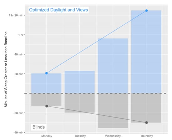 The detrimental effect of moving from the baseline condition and into the office with blinds and the beneficial effect of moving into the office with optimized daylight and views was graphed in order to visualize both the immediate and cumulative effects of the office condition on sleep (Figure 4). The sleep duration greater or less than baseline was calculated for each participant based on the sleep duration measured by their actigraph during the baseline weeks (average baseline sleep across the 24 participants was 6 h 11 min). The immediate effect—that is, the effect of working in the condition for one day—is demonstrated by the shorter sleep duration observed on Monday night in the blinds condition compared to baseline and the longer sleep duration observed on Monday night in the optimized daylight and views condition compared to baseline. The figure also demonstrates the sleep debt or sleep benefit accumulated over the course of the work week in each condition (Figure 4).
