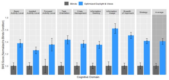 Cognitive scores on the Strategic Management Simulation (SMS) assessment for each of the nine domains of cognitive function, normalized to the Blinds condition.