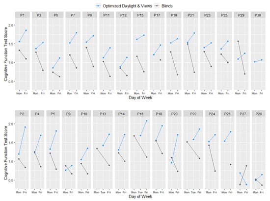 Participants, on average, scored 42% higher (p-value < 0.0001) on cognitive assessments in the optimized daylight and views condition compared to the blinds condition. Similar to sleep, cognitive performance demonstrated an acute benefit after one day in the space that compounded with increased time in the space. The effect after one day of optimized daylight exposure was 7%, which could be attributed to the impact of improved views outdoors and to the alerting effects of short wavelength light [,]. By Friday, the difference in cognitive function scores was 79%, suggesting a cumulative effect on cognitive performance from daylight deprivation. The improvement in scores between each condition and within each condition from Monday to Friday was highly consistent across all participants, regardless of their baseline performance on the assessment, job function, demographics, or distance from the window.