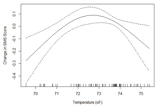 Temperature exhibited a non-linear relationship and was kept in the model as a penalized spline (Figure 7). The spline shows a U-shaped curve with optimal cognitive function scores between 72°F and 73°F. In an analysis of the variance of the model, 37.4% of the variability in scores was explained by the random effect for participant, 25.3% was explained by the fixed effects for condition and temperature, and 37.3% was unexplained by the model.