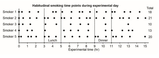 Smokers could smoke ad libitum during the experimental day, which resulted in an average of 17 cigarettes per day (10–21 cig/day) (Figure 1). Time between two cigarettes differed between 20 min and 3 h. For all participants, the second cigarette of the day was smoked within an hour after the first cigarette and the final cigarette of the day within an hour before going to bed.