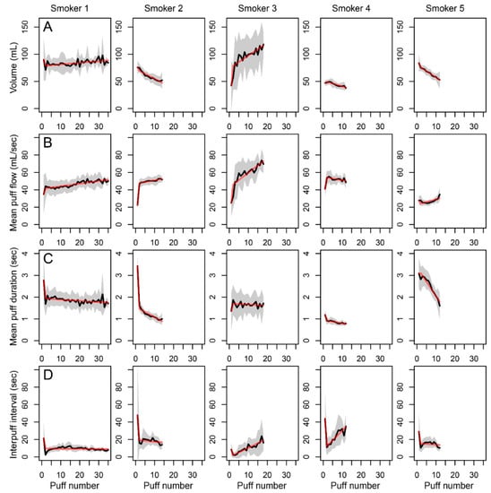 Although some participants had a marginal variation in a specific puff parameter (e.g., participant 1 puff volume), overall, the puffing profiles of each cigarette smoked by the participants were not substantially different over the course of a day. This indicates that self-reported preferred cigarettes were not subject to change in puff parameters. This is in line with Hammond et al., who found a high degree of stability in puffing profile within subjects over time in three 1-week trials []. Interestingly, a study of Grainge et al. found a slightly lower intensity of smoking of the first cigarette of the day compared to other cigarettes during the day [].