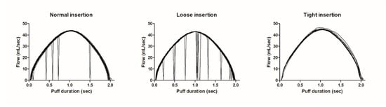 The flow-dropouts in the raw data were characterized by the recorded signal dropping to zero followed by the pre-dropout flow rate, which could occur at any time during a puff and was visualized in Figure 3. In the case of a normal insertion, an occasional flow-dropout (five per cigarette) was measured in a single puff whereas when the cigarette is loosely inserted, more flow-dropouts occurred (nine per cigarette). No flow-dropouts occurred after tight insertion into the device, which means there was no failure in the flowrate recording.