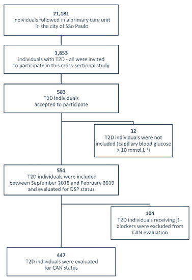 Among the 21,181 individuals followed in the basic health unit in the city of São Paulo, 1853 had T2D and were invited to participate in this cross-sectional study during home visits by community health agents. A total of 583 out of 1853 T2D individuals agreed to participate and 551 were included between September 2018 and February 2019; in total, 32 individuals were not included because their capillary blood glucose was >10 mmol∙L−1 at the day of evaluation (hyperglycemia may affect the results of the autonomic tests) (Figure 1). Thus, this study was conducted in a convenience sample, since there was no sample size calculation, and was conducted in compliance with the Declaration of Helsinki, in accordance with the institutional ethics committees (Universidade Nove de Julho, # 81249417.1.0000.5511; Secretaria Municipal da Saude de São Paulo, # 81249417.1.3001.0086). After signing informed consent, participants were assessed for demographic, clinical, and biochemical features, and for the status of DSP and of CAN, whose evaluations were performed by three trained nurses. The estimated glomerular filtration rate (eGFR) was calculated by CKD-EPI [7]. The primary care unit has no ophthalmologists in its medical staff and the screening for diabetic retinopathy is performed in secondary care units by different ophthalmologists. For that reason, data about retinopathy are not being presented. Arterial hypertension was defined as systolic/diastolic blood pressure ≥ 140/90 mmHg or use of anti-hypertensive drugs not for renal protection purposes. Hypercholesterolemia was defined as the use of statins and/or an LDL-cholesterol > 2.6 mmol∙L−1 (100 mg∙dL−1).