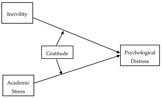 While both academic stress and incivility pose potential external threats to people who subsequently might experience psychological harm, gratitude could be inversely related to indicators of psychological distress, such as stress and depression [21,22]. Gratitude is defined as an affective human characteristic directed towards other people that results from a proactive acknowledgement that one has obtained a positive outcome and others have made certain sacrifices for this positive outcome [23]. Emmons [24] suggested that a grateful attitude towards life tends to provide protection when people are facing hardship and turmoil and allows for the development of a more powerful resilience to deal with adversity and crisis. The expression of appreciation has the potential power to transform stress into opportunity [25]. Individuals with high gratitude to others are more likely to appreciate daily events in life, which in turn could facilitate adaptive coping to curb stress [26,27]. In other words, gratitude can play a buffering role in the relationship between stress and psychological distress [28].