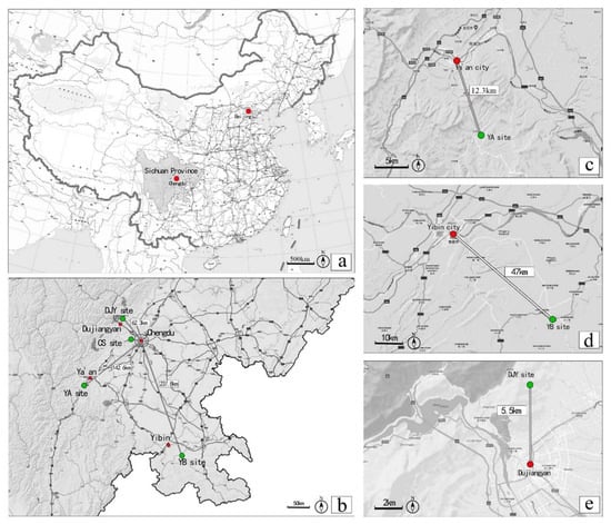 Maps of experimental sites. (a) Sichuan Province in China; and (b) the four sites in Sichuan Province; (c) Ya’an sites (YA); (d) Yibin sites (YB); (e) Dujiangyan sites (DJY). The red points mark the downtown areas, and the green points mark the location of each site.