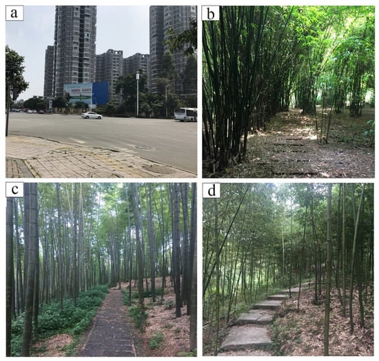 Photographs of the studied sites. (a) The CS site was located at a crossroad in a typical urban environment with cars, buildings, markets, hotels, and companies; (b)–(d) show the bamboo forest sites with path. (b) Neosinocalamus affinis bamboo forest; (c) Phyllostachys heterocycla bamboo forest; (d) P. praecox f. prevernalis bamboo forest.