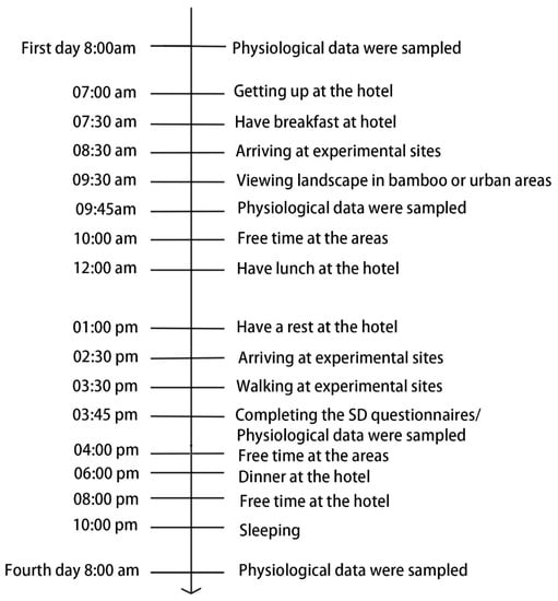 We chose to conduct this study in September, as it is a suitable month for outdoor travel. The weather was sunny during the experimental period. On the afternoon of September 19th, the subjects were divided into four groups. The groups arrived at the arranged hotels near the given experimental sites. The experimental sites were flat areas where the experiment could be easily conducted. All hotels were located in the bamboo forest and urban approximately 300 m from the experimental site. To prevent the influence of subjective psychological effects, the subjects were allowed to do as they wished in the hotel but were instructed to avoid strenuous exercise and any stimulating activity in their hours of relaxation before sleeping. On the morning of September 20th, 2017, the first day of the experimental period, each group was taken to its respective experimental site after a normal breakfast. The subjects sat on chairs and viewed the landscape for 15 min, then the physiological data were sampled. They walked around the area for 15 min in the afternoon, physiological data and SDM questionnaires were sampled. The course terrain, distance, and walking speed were appropriate for moderate energy expenditure. After completing the walking and viewing activities, the participants were allowed to move freely within the experimental sites until mealtime. All of the subjects were instructed to remain at their assigned experimental site from 9:00 am to 5:00 pm, except during lunchtime. After the first day, the same procedure was conducted for the next two days (Figure 3).