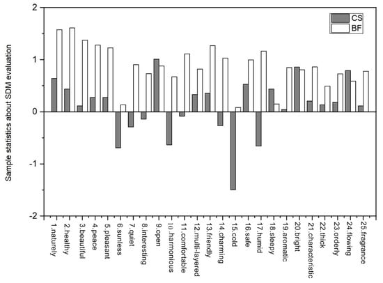 The comprehensive environmental characteristics of the bamboo forest (BF) sites were compared with those of the urban environment (CS) in an environmental evaluation (Figure 4).