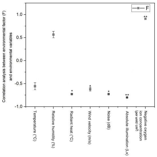 After “walking,” according to the SDM sensual evaluation F scores, the sensory composite scores (F) to the environment and the environment temperature, relative humidity, thermal radiation, and wind speed, noise index, the absolute intensity of illumination, and negative oxygen ion correlation analysis results are shown in Figure 5. It is shown that the subjects of sensory evaluation and environmental temperature, radiant heat, wind speed, noise, the absolute intensity of illumination were significant, or significantly negatively correlated; the results show that the lower the environment variable, the higher the subjects for the environment of the sensory evaluation. The results showed that the higher the concentration of air negative oxygen ion, the higher the sensory evaluation of the environment.