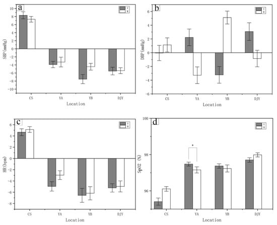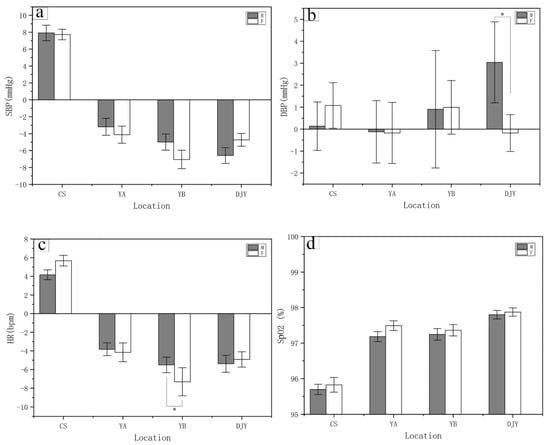 Changes in systolic blood pressure, diastolic blood pressure, heart rate, and peripheral oxygen saturation in participants after bamboo forest and urban program. One-way ANOVA (Turkey’s test) was used to compare the data between male and female subjects after three days of bamboo forest therapy. The data are presented as the mean ± SEs; * p < 0.05; significant difference between the data for male and female subjects for the physiological indexes by paired t test. CS (n = 30), City site; YA (n = 30), Ya’an sites. YB (n = 30), Yibin sites. DJY (n = 30), Dujiangyan sites. (a) SBP, systolic blood pressure; (b) DBP, diastolic blood pressure; (c) HR, heart rate; (d) SpO2, peripheral oxygen saturation.