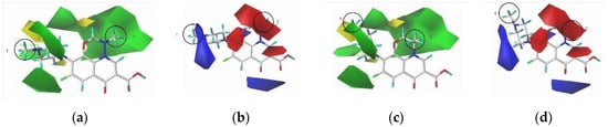 The contour maps of (a) Marbofloxacin (steric field), (b) marbofloxacin (electrostatic field), (c) levofloxacin (steric field), (d) levofloxacin (electrostatic field)