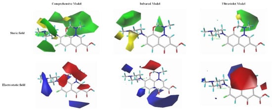 This study uses marbofloxacin and levofloxacin as examples to modify the substituents at positions 1 (CH3) and 2 (CH3), respectively. From the contour maps of marbofloxacin, it can be seen that the area near the 1-position substituent is mainly blue, indicating that the introduction of a positive group at the 1-position substituent is beneficial to improve the QAs’ CI; the green and red regions near the substituent at position 2 indicate that the introduction of bigger molecular groups and negative groups at the substituent in this position is conducive to improving the comprehensive effect value of the infrared and ultraviolet spectra of QAs. From the contour maps of levofloxacin, it can be seen that the vicinity of the substituent at position 1 is mainly blue, indicating that the introduction of a positively charged group at the substituent in this position is beneficial to improve the CI of QAs. The regions near the 2-position substituent are mainly green and red, indicating that the introduction of bigger molecular groups and negative groups at the 2-position substituent is conducive to improving the CI of QAs (Figure 2).