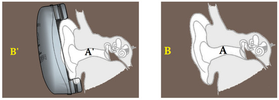 The attenuation of HPDs implemented via the F-MIRE test method, which examines the relationship between the insertion loss (IL) and the noise reduction (NR), where TFOE is the transfer function of the open ear, is shown in Figure 2. When the HPD (earplugs or earmuffs) is worn, the exposure volume in the ear is A’, and the noise exposure volume at the position of the external reference point wearing the HPD is B’. The difference between A’ and B’, i.e., B’ – A’, represents the noise reduction (NR). However, regardless of the type of HPD, while subjective sensory testing by the human ear is used, the difference between the sound pressure level without and with the HPD, i.e., A – A’, is called the insertion loss (IL), which is equivalent to the difference in the hearing threshold measured whether the HPD is worn or not, i.e., REAT. Therefore, when the NR and IL values are compared with each other, no correction will result in an error of 5–10 dB in the measured value [22].