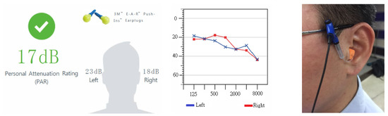 NRR considers the individual differences of the wearer. Thus, the calculated protection average is subtracted by two standard deviations to determine the point at which 97% of wearers can wear this HPD and achieve the desired NRR value. Based on the consideration of protecting workers’ hearing from damage due to exposure, institutions should choose HPDs marked with the tested sound-attenuation value according to the conditions of the workplace [15]. Although the NRR aims to achieve a theoretical noise reduction for 98% of workers if they follow the HPD instructions, according to the research, fewer than 5% of workers actually reach the protection level predicted by the NRR [16,17]. At present, there are many systems available for measuring the attenuation performance of HPDs worn by workers in workplaces, including the following: real-ear attenuation at threshold (REAT) (see Method B of ANSI S12.6-1997 and SA/SNZ 1270), which is particularly intended for continuous usage conditions and can provide estimates of field performance [15], field microphone in real ear (F-MIRE), and acoustic text fixture (ATF). In this study, one of these test methods was specifically introduced, the F-MIRE [18] system, which combines a single miniature two-element microphone and relevant professional technologies [19,20,21].