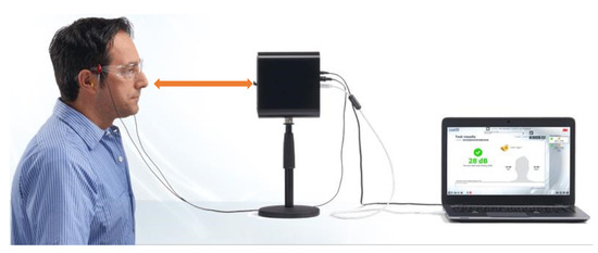 In Taiwan, the labor noise exposure in many industries still exceeds the regulation of 90 dBA for TWA (the time-weighted average sound pressure level during an 8 hour working day with noise exposure). Even if employers provide and require the wearing of HPDs for tasks involving noise, there are still laborers who are classified as “health management level 4” in health management, the cause of which is worthy of in-depth discussion [22,23]. Therefore, this study was conducted through onsite visits in the high-noise manufacturing industry to two steel plants (Factories A and B) and a textile factory (Factory C). The 3M™ EA-RfitTM (3M, St. Paul, MN, USA) HPD adaptability evaluation system is shown in Figure 1. It was adopted to measure the personal attenuation rating (PAR) of laborers while wearing HPDs in these three noisy workplaces. In this study, we also analyzed the spectral characteristics for the high-noise work type and implemented an external sound pressure level test after HPDs were worn. We expected to establish an HPD-fit test method and to determine whether it met the noise exposure standards. We provide an effective evaluation of hearing-protection devices as references.