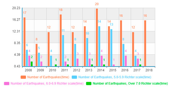 China is a large country with mountainous areas, where a large number of people live [25,26,27]. Affected by geological movement, China has suffered frequent earthquake disasters in recent years, causing a large number of deaths, serious damage to property, and far-reaching impacts on social and economic development. In the past 10 years, the country has experienced 159 earthquakes of at least magnitude 5 on the Richter scale. Among these, there have been seven major earthquakes with magnitudes above 7, 26 strong earthquakes with magnitudes between 6 and 6.9, and 83 moderate earthquakes with magnitudes between 5 and 5.9 (Figure 1). These earthquake disasters resulted in more than 48,000 casualties and 1.13 trillion Yuan in economic losses. The Wenchuan and Lushan earthquakes were the deadliest among the seven major earthquakes. For instance, the Wenchuan earthquake in 2008 caused about 450,000 casualties and direct economic losses as high as 845.2 billion Yuan [28]. The disaster risk management of China’s Sichuan earthquake disaster area was relatively small; therefore, relevant research is urgently required [24,29].