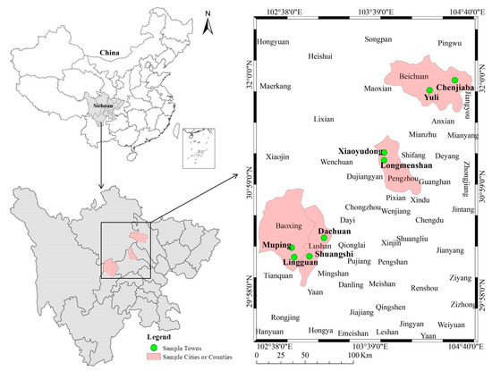 The data used in this research were mainly acquired from a questionnaire survey conducted by the research group in areas affected by the Lushan and Wenchuan earthquakes in July 2019. The study used one-on-one interviews to evaluate behavioral responses to disaster risk perception and disaster preparedness. To ensure that representative and non-biased samples were tested, stratified random sampling was performed. A total of 327 households were investigated from 16 villages of eight townships in four counties. For a detailed introduction, please refer to Xu et al. [24]. See Figure 3 for the location of the sample counties and towns.