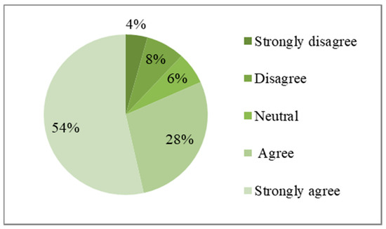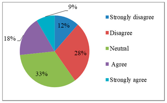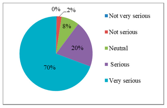 Figure 5 shows the distribution of the perceived probability of events. Approximately 27% of residents thought that another major earthquake may occur in the next 10 years, while 40% of residents did not believe this. The remaining 33% of residents were neutral. Figure 6 shows the distribution of perceived severity of events. Approximately 82% of the residents believed that another major earthquake will seriously affect their lives and safety of property, while 12% of the residents did not have these concerns. The remaining 6% of residents held a neutral attitude to this question.