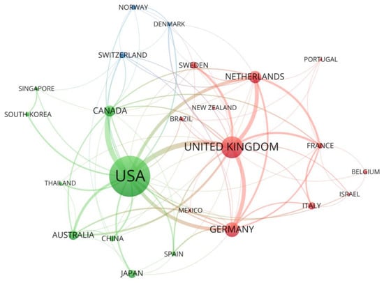 The country collaboration network, shown in Figure 3, shows that the most active countries in North American and Western Europe, the United States of America and the United Kingdom, are also the ones with most international collaborations. Transatlantic collaboration is strongest between the USA and the UK, but Germany and the Netherlands also have such links. While the USA has the strongest academic links with Canada, Australia, Japan, China, and South Korea, the UK has stronger links with other European countries.