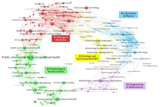 The distribution of scientific categories associated with risk communication is shown on the global science map [] using the VOSviewer software []. The results are shown in Figure 4, where the global scientific categories are grouped in five clusters. These are #1 ‘Biology and Medicine’, #2 ‘Chemistry and Physics’, #3 ‘Ecology and Environmental Science and Technology’, #4 ‘Engineering and Mathematics’, and #5 ‘Psychology and Social Sciences’.