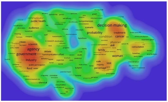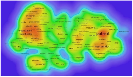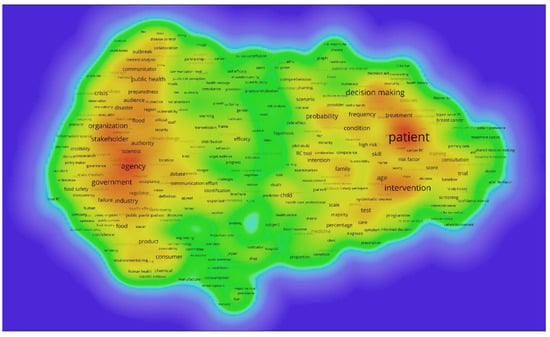 Term density map of risk communication research, all documents (458 terms included).
