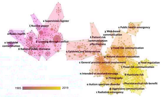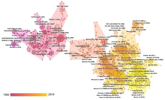 CiteSpace [] is applied in this section to perform a co-citation analysis of the risk communication dataset of Section 2.1 in order to determine research clusters based on co-citation information. Co-occurrence of certain references in a set of articles within a research domain is a commonly used technique in scientometric research to identify clusters []. Highly cited references within these clusters can be understood as the intellectual basis of the subdomains and represent key knowledge carriers for the development of the research domain. Articles citing the largest number of references from a cluster are known as ‘research fronts’. These can be seen as spearheading contributions leading the development of the research domain, and together they provide insight in the overall evolution of the research domain in terms of focus topics [,].