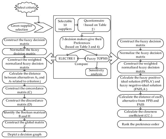 Based on the above research, this paper proposes a framework that companies can use when choosing green suppliers. The framework was determined through literature research and discussion, and adopted a qualitative and quantitative method to select green suppliers, as shown in Figure 1. In addition, this section briefly introduces the solution methodology in the framework. Specifically, fuzzy sets, linguistic variables, fuzzy TOPSIS methods, and ELECTRE I.