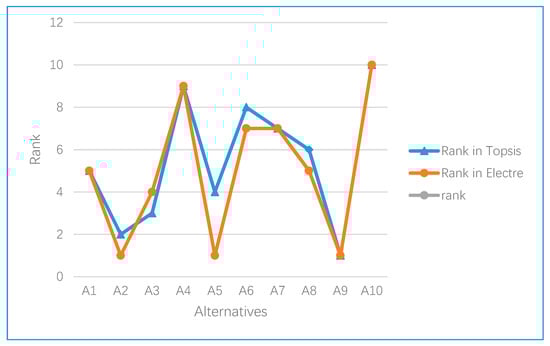 (5) The goal of the TOPSIS method is ranking problematic; the goal of the ELECTRE method is choice problematic []. The TOPSIS method can provide a selection sequence of alternatives; the ELECTRE method will provide a set of good alternatives.