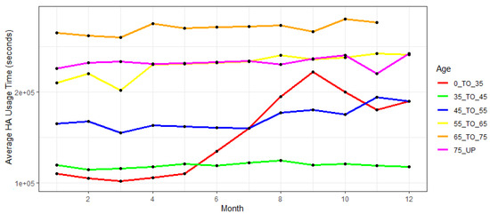 - Average HA usage among the entire population grouped by the participants’ age for each month since the fitting date.