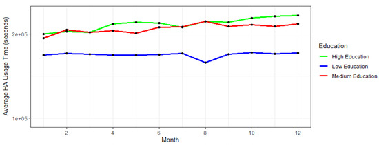 Figure 5 demonstrates the average HA usage per education level group during the course of the time. Highly educated participants show both the best progress, i.e., constant growth of HA usage, except for the last month, as well as the highest average HA usage over the examined period. The second group of the participants, i.e., participants having a medium level of education exhibit the highest HA usage in their starting month; however, as time passes slower growth and stagnation can be indicated in their HA usage. Lastly, participants having lower education levels exhibit a lot of oscillations in their average HA usage. Thus, this group of participants can be considered to be most likely under the risk of dropping out from the further study.
