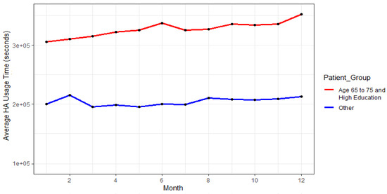 Results of the showcased analyses suggest that highly educated patients, aged 65 to 75 years are the safest group for the study. Figure 6 indicates a comparison of the average HA usage of this group compared to the average HA usage of the remaining participants.