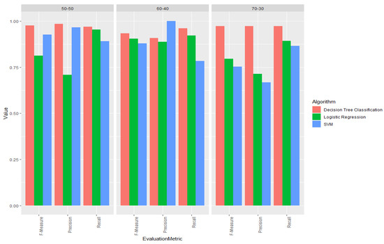 Consequently, precision, recall, and f-measure results are shown in Figure 7. It can be observed, decision tree classification performed the best in all three cases in terms of recall and f-measure, as well as in two out of three cases in terms of precision. On the other hand, logistic regression and SVM algorithms had a comparable performance, which was in turn significantly lower than the performance of decision tree classification. This is especially the case in the third use case, where the dataset was divided according to the ratio 70:30. Performance drop can be potentially attributed to the fact that the further parameter tuning for those models is required. As a matter of fact, due to the ease of use and high performance, for this specific use case, decision tree classification is a recommended classification algorithm of choice.