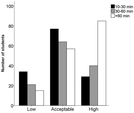 Associations were also found between perceived physical fitness and the duration of exercise sessions. Figure 1 shows a distinct tendency among those students who perceived their own physical condition as good, with a greater percentage of students undertaking sessions of more than one hour (χ2 (2) = 39.534; p < 0.001).