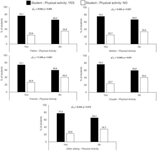 Regarding gender, the most positive association for the male students was with the PA of fathers, mothers, both parents, friends, and partners (χ2 (1) = 9.142, p = 0.002; χ2 (1) = 4.538, p = 0.033; χ2 (1) = 5.421, p = 0.020; χ2 (1) = 10.269, p = 0.001; χ2 (1) = 9.632, p = 0.002, respectively) whereas for the women the most influential factors were ordered as follows; both parents, partners and older siblings (χ2 (1) = 11.570; p = 0.001; χ2 (1) = 11.102, p = 0.001; χ2 (1) = 6.357, p = 0.012, respectively).