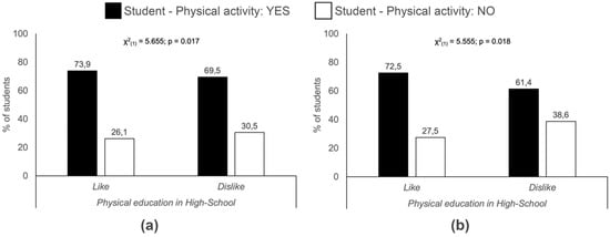 Although the percentage of students that enjoyed PE in primary school and that continue to undertake PA (71.3%) is greater than the percentage of students that currently do PA despite not enjoying school PE (62.3%), there is no significant association (χ2 (1) = 3.764; p = 0.052). However, examining the case of the female students separately, the association is clear. Specifically, 70.0% of the women who enjoyed primary school PE continue to exercise at present; on the other hand, only 54.2% of those who did not enjoy primary school PE still exercise (χ2 (1) = 6.765; p = 0.009).