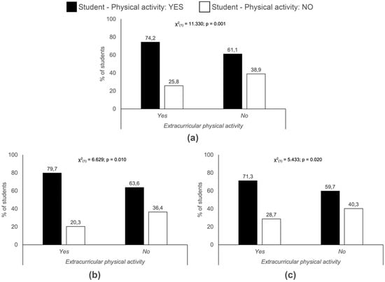 Relation between physical activity and participation in extra-curricular sports activities organized by the educational centre. (a) Total sample; (b) Men; (c) Women.