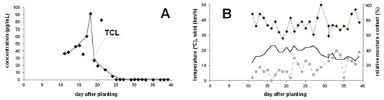 Neonicotinoid thiacloprid (TCL) occurrence from the seed coating in a commercial maize variety (LG 30.369) cultivated under field conditions (sown in May). (A): Concentration of TCL (µg/mL) in the guttation liquid of maize as a function of time after sowing. (B): Meteorological parameters during the sampling period recorded at 7:30 a.m. each day. Relative moisture content (%, ♦ dotted line), temperature (°C, continuous line) and wind speed (km/h, • dashed line).