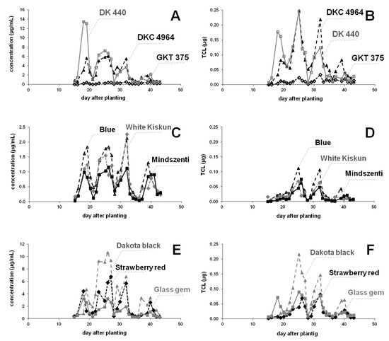 Neonicotinoid (TCL) occurrence from the seed coating in commercial (A,B; DK 440 □, DKC 4964 − Die Sandra ▲, GKT 372 ◊), Hungarian landrace (C,D; Blue Δ, White Kiskun ♦, Mindszenti ■) and „heirloom” (E,F; Dakota black ▲, Strawberry red ♦, Glass gem ■) maize varieties cultivated under semi-field conditions (sown in April). Concentration of TCL (A,C,E; µg/mL) and average amount of TCL (B,D,F; µg) excreted by a single plant in the guttation liquid of maize as a function of time after sowing.