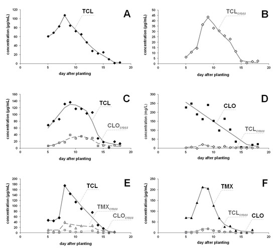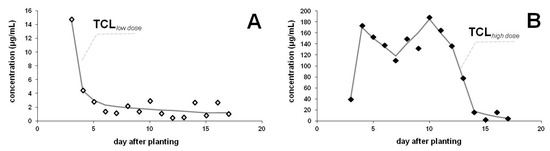 Reported values for the estimated dissipation half-lives (DT50s) for TCL in soil vary in a broad range, but typically fall between 3 and 74 days [43]. The fact that TCL was detected up to 64 days after planting indicates a long-term presence of this AI exuded from the plant tissues into the guttation liquid.