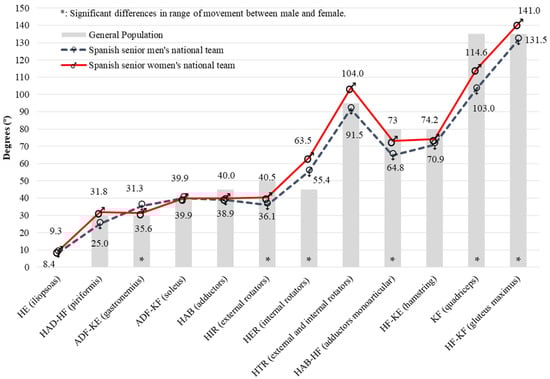 When ROM values have been evaluated in sport, it has been observed a great variation between different sports [] and even within the same sport, depending on joint and movement [], sex [,], age [], competitive level [,], lateral dominance (dominant and non-dominant) [], and/or tactical position [,]. Likewise, different studies have shown that the restriction in these ROM values could negatively affect sports performance [,,] and increase the injury risk []. The limited hip extension ROM (<13°) have been related to ankle sprains and thigh muscle strains in senior soccer players [], as well as to rectus abdominal muscle strains [] in professionals tennis players; limited ankle dorsiflexion ROM may also predispose to patellar tendinopathy (<45°) in volleyball players [] and basketball players (<36.5°) []. In ice-hockey players, limited hip abduction ROM (<67.5°) have been related to groin injuries [].