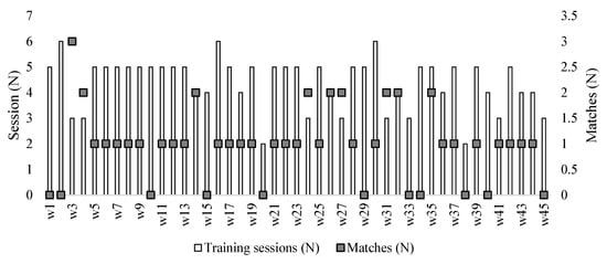A descriptive research design was used in this study. Players from a professional team that participated in the First League of a European country (included in the “big five” leagues) were monitored daily. Their external loads for training sessions and matches were measured over a full season. The study began on 3 July 2018 and ended on 9 May 2019. Forty-five weeks were analyzed (Table 1). Each player used an 18 Hz MEMS unit during the training sessions and matches. The external load measures of total distance (TD), distances covered at 14 km/h−1 or above (DC > 14 km/h), high-speed running above 19.8 km/h−1 (HSR) distance, and number of sprints above 25.2 km/h−1 were collected. The acute load (accumulated load of training and matches of each week) was calculated for each player. Moreover, the training monotony (within-week load variation) and training strain (training monotony multiplied by acute load) were calculated once per week for each measure and player. Following the objectives of this study, the acute load, training monotony, and training strain calculations for each external load variable were presented throughout the 45 weeks.