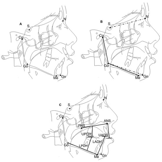 All lateral radiographs were taken in natural head position before the orthodontic treatment [33,34,35]. One operator traced all lateral cephalograms with cephalometric software (Delta-Dent, Outside Format, Piolla, Italy). Cephalometric landmarks, lines, and measurements identified and traced on lateral cephalograms in order to evaluate facial typology are shown in Figure 1A–C. To determine facial divergency and sagittal malocclusion the angles SN^GoGn and ANPg^ (Point A-Nasion-Pogonion angle) were used. The sagittal malocclusion was classified into three groups according to the ANPg^: Class III with an ANPg^ less than 0°, Class I with an ANPg^ between 0° and 4°, and Class II with an ANPg^ greater than 4°. Subjects were classified as brachyfacial when SN^GoGn was less than 27°, normofacial when SN^GoGn was between 27° and 37°, and dolichofacial when SN^GoGn was greater than 37°. The mandibular structure was measured with the CoGoMe^, which is the angle between the condylar axis (Condylion–Gonion) and the mandibular base (Gonion–Menton). Finally, the dentoalveolar heights (upper or lower and anterior or posterior) were measured as